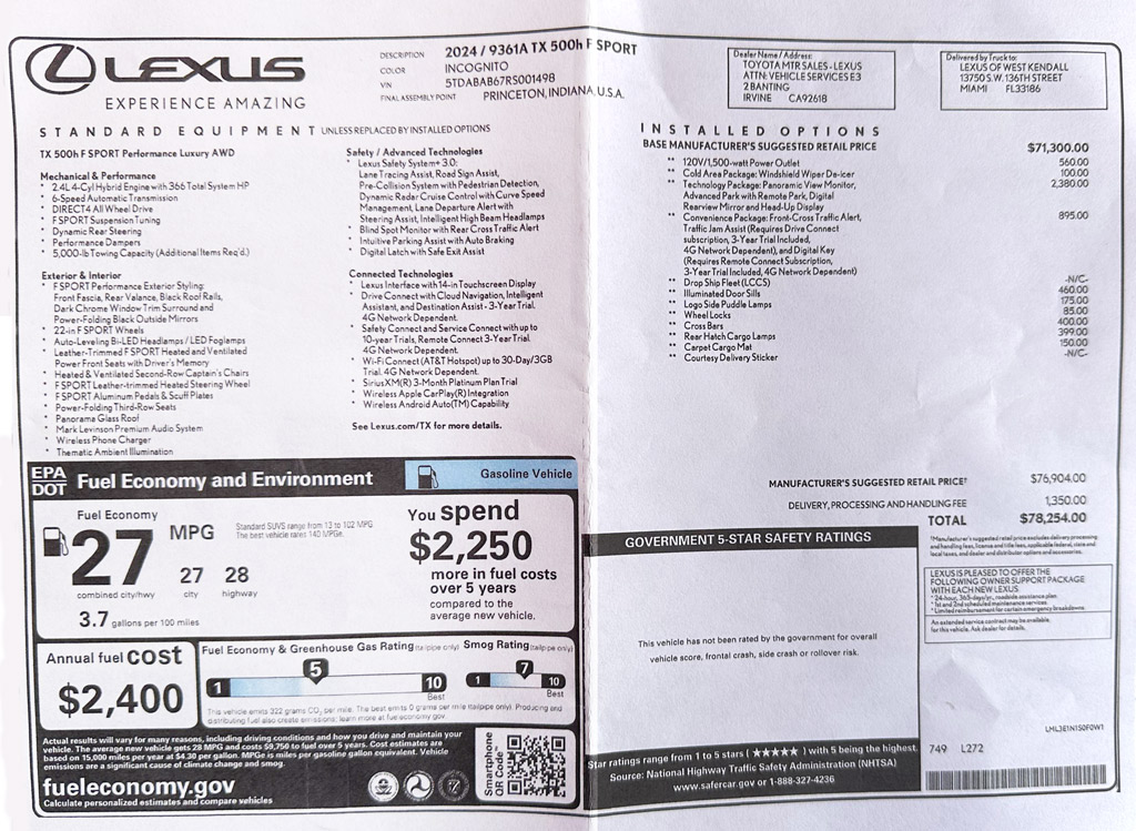 Miami Motor Media Lunch 2024 Lexus TX L500h F Sport 14 Mar 2024. Restaurant Las Acacias - 8200 NW 14 Street